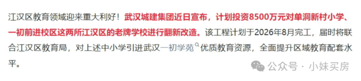 值得一提的是,根据官媒报道,武汉城建集团计划投资8500万元对单洞新村小学、一初前进校区这两所江汉区的老牌学校进行翻新改造。