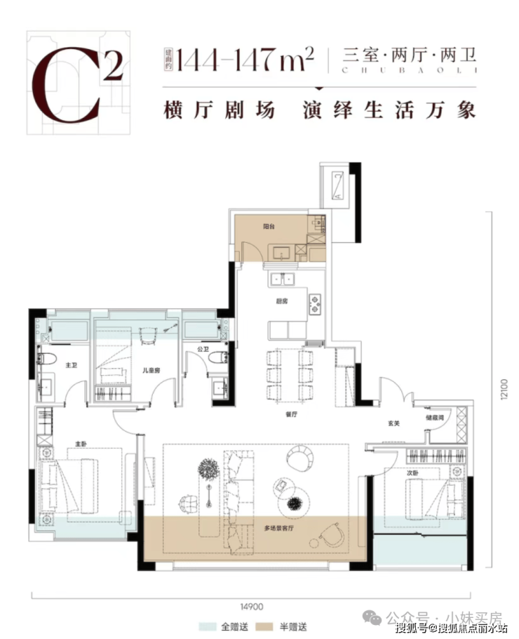 154平三房户型,客厅做成了270度转角设计,配合楼栋位置,可俯瞰小区内部园林,视野景观效果更好;并且主卧带双面全尺寸飘窗,不仅拓展面积更多,视野也再次叠加,同样也是双阳台设计。