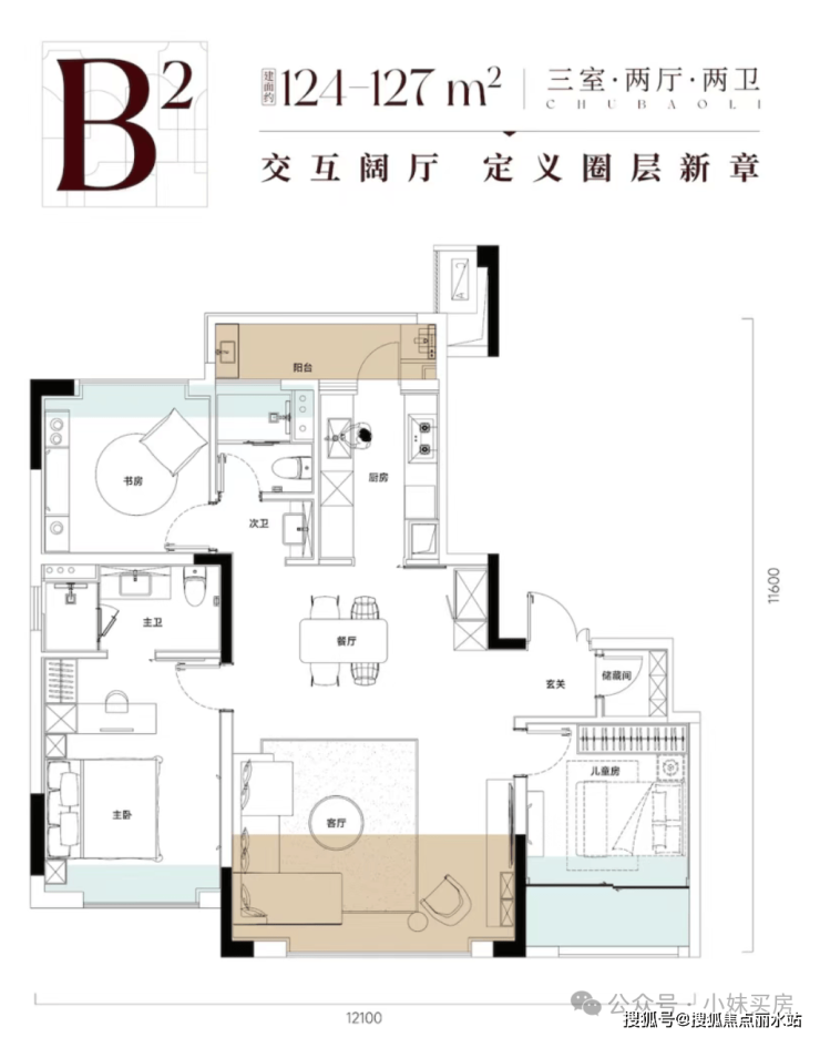 位于12号楼内,也是三开间朝南、带南北双阳台的布局,南向面宽约12.1米,尺寸更优秀,大横厅轻松get;三个卧室均带飘窗,此外,次卫内也有一个飘窗赠送,整体可拓展面积较106平户型更多。