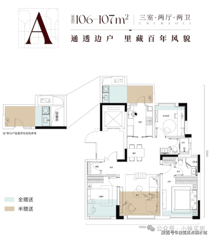 位于11号楼内,属于西瞰小区园林景观的朝向;三开间朝南,西南面开间约10.5米,还比较开阔;南北双阳台,北向阳台外还带一个设备平台,后期可以利用;三个卧室均带全尺寸飘窗,其中儿童房的可拓展面积较另外两个卧室更多。