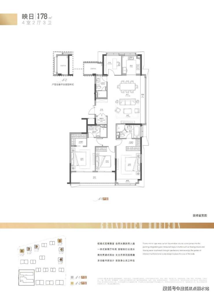 178㎡户型解析:4房2厅3卫,270°边套设计,三面采光,视野较好实用性强,三房朝南,实用性强。目前挂牌6套,最低售价1000万起!