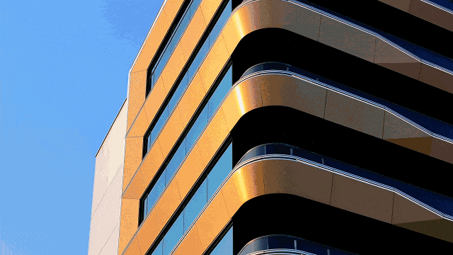 整体采用四面铝板+玻璃幕墙的配置,其中,临江楼幢立面以钱塘江自然曲线为设计灵感,搭配了大面积的横向金色双弧面铝板,极具辨识度;后排楼幢则采用了大尺幅的银色铝板,并辅以横向的斜切铝板线条,简洁大气。