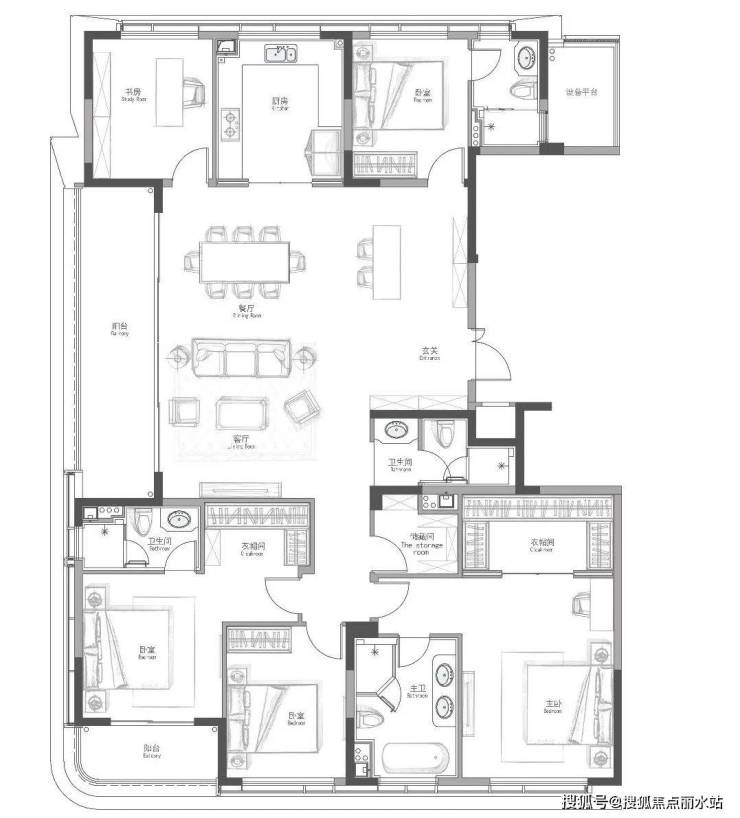 这个户型的亮点在于双阳台设计,其中一个是客餐厅外的约6.9米的侧边阳台;第二个妙处是第二主卧包含一个约5.4米南向面宽的宽景阳台。