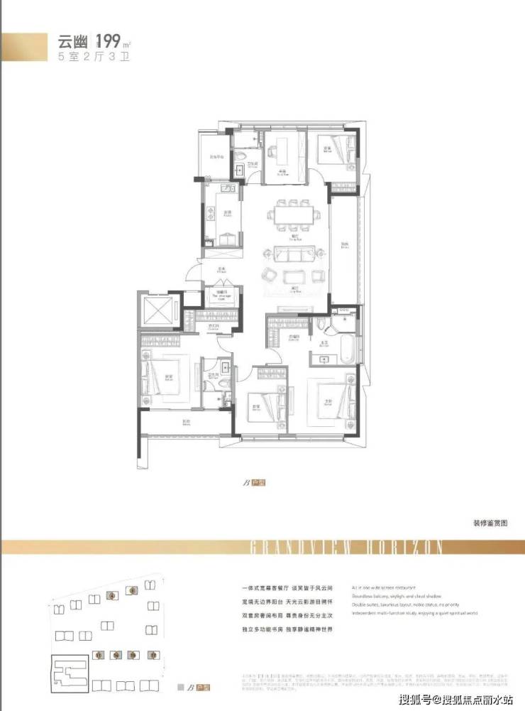 199㎡户型解析:5房2厅3卫,270°边套户型设计,更大视野,双阳台设计,功能性强。双套房设计,配独立卫生间和衣帽间,舒适性较好。目前挂牌15套,最低售价1280万起!