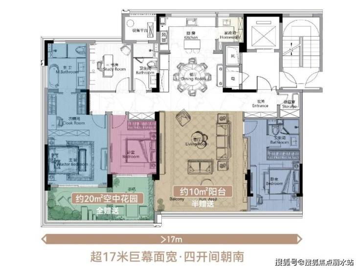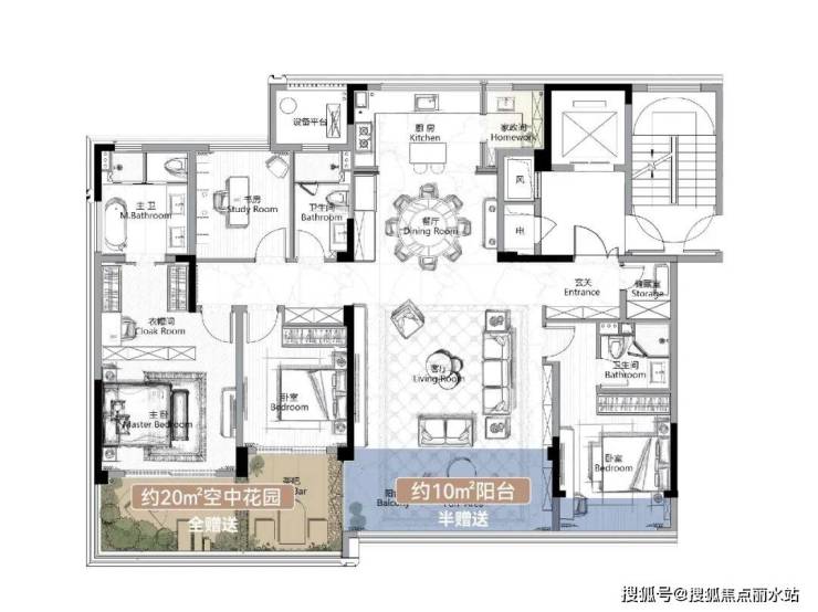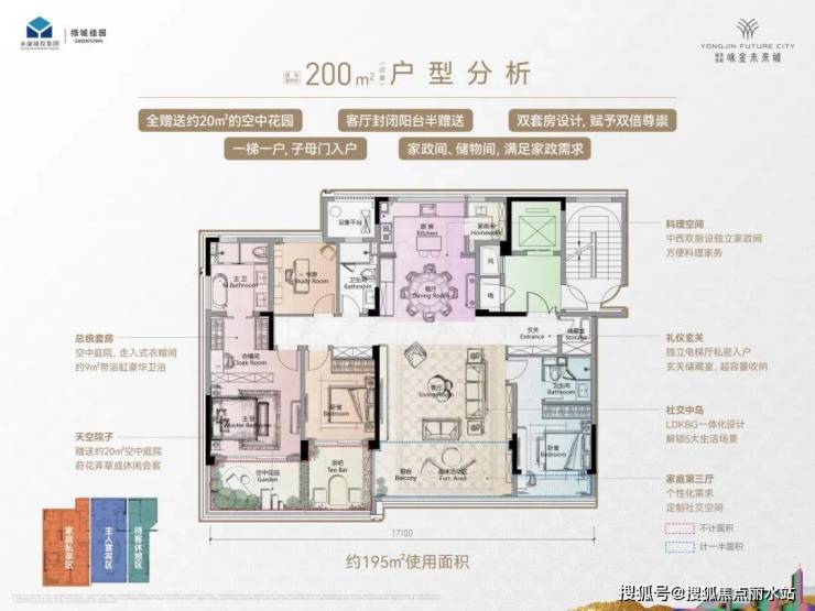其次是,用多赠送消灭公摊。该户型实现近20m²的空中花园全赠送,以及近10m²阳台半赠送,再加上设备平台赠送的面积,整个空间的实际使用率达到近100%,按市面一般高层80%得房率来计算,为购房者省下超70万!“豪宅品质+高实用率带来的超值性价比”,城投绿城·咏金未来城建面约200m²备受追捧,自在情理之中。