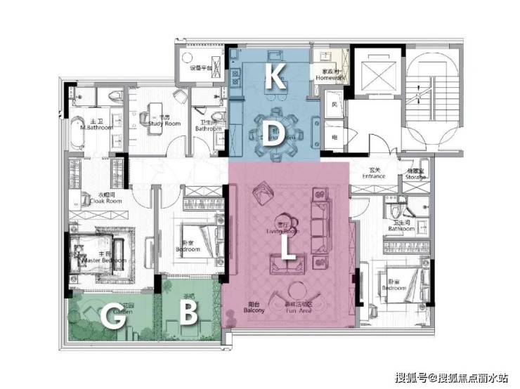 “开放式餐厨一体空间+社交横厅+私属阳台+空中花园”,大剧场式的LDKBG一体化空间,形成三代人共时性活动带,厨房备餐的妻子和母亲不是孤岛,兼顾着客厅玩耍的孩子,同时和阳台下棋的丈夫和父亲唠着家常。