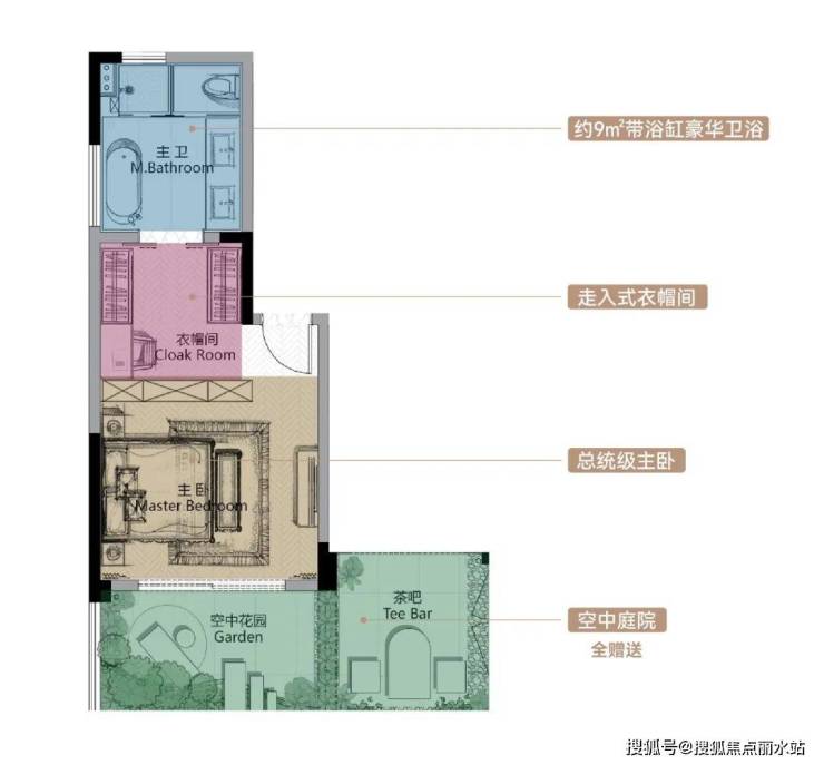 “小家化”的主卧套房,配置了走入式衣帽间、约9m²带浴缸以及双台盆的豪华卫浴间,外接空中庭院,让居者轻松实现围炉煮茶、莳花弄草、绘画阅读等生活理想。