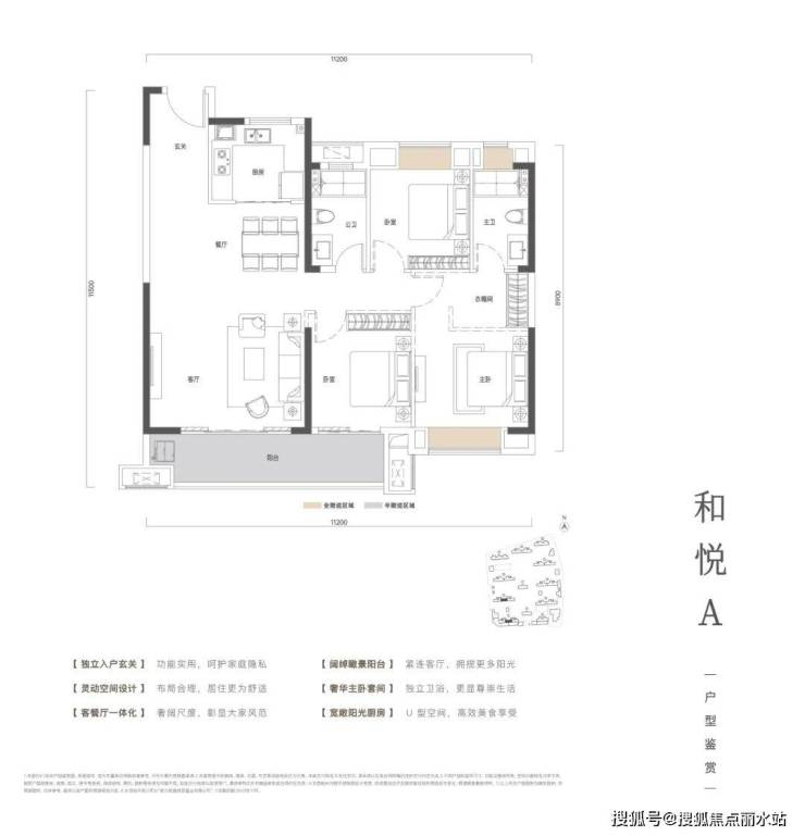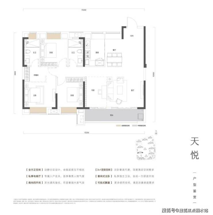 该户型是22号楼端头边户,南北通透,3+1开间朝南,南向大阳台+4个飘窗,室内空间更开阔、优化面积更多。