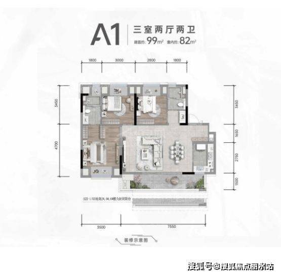99㎡三房:户型方正,格局科学,大横厅连接景观阳台,主卧面积阔绰,卧室都带飘窗