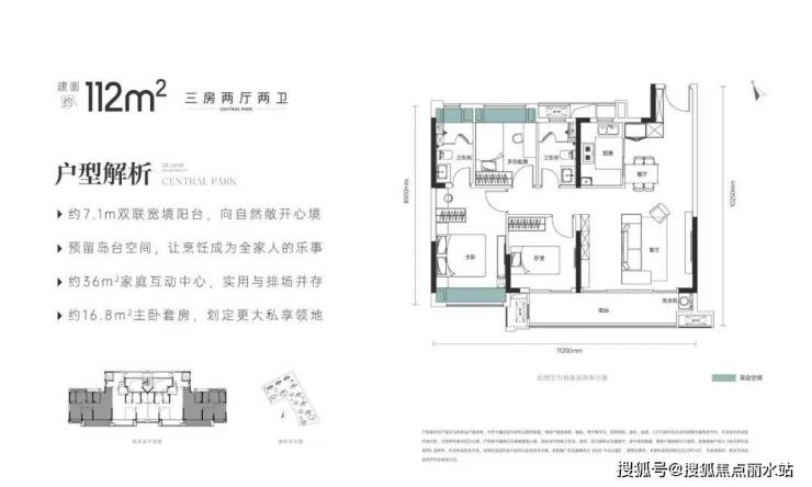 比如建面约109平 三房两厅两卫,属于连廊中间套,优化面积除了阳台之外也就三个飘窗,北侧私密性一般,不过它客厅开间做到了5.5米,空间感比较出色。