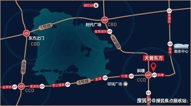 双轨交汇黄金四角环湖四轨交汇,缔造金鸡湖黄金四角,西北-东方之门、东北-时代广场、西南-李公堤、东南斜塘老街一黄金四角所在核芯价值所向.