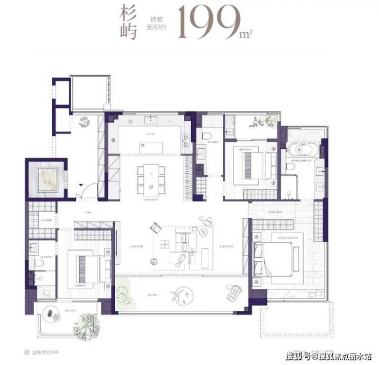 建面约199㎡三房两厅两卫,户户空中花园,南北双阳台,270°观景视角,8.1米超大横厅;