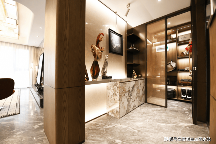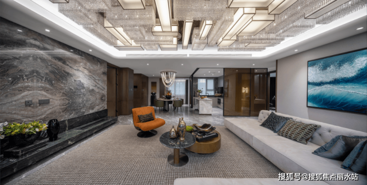 在空间铺装上采用超大规格岩板,以提升空间高度铺贴平整度;采用对花拼缝细致工艺处理,以呈现更好的空间美感与视觉享受;地面铺装约1.8米*0.9米的大块瓷砖,以营造时尚大气的氛围感,彰显生活的格调与品位;室内沙发背景墙由乳胶漆升级为整面墙木饰面,以延长使用寿命升华空间艺术感;对厨房的独立式全岛台边缘进行倒角式弧度化处理,以避免可能发生的安全隐患……