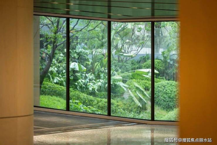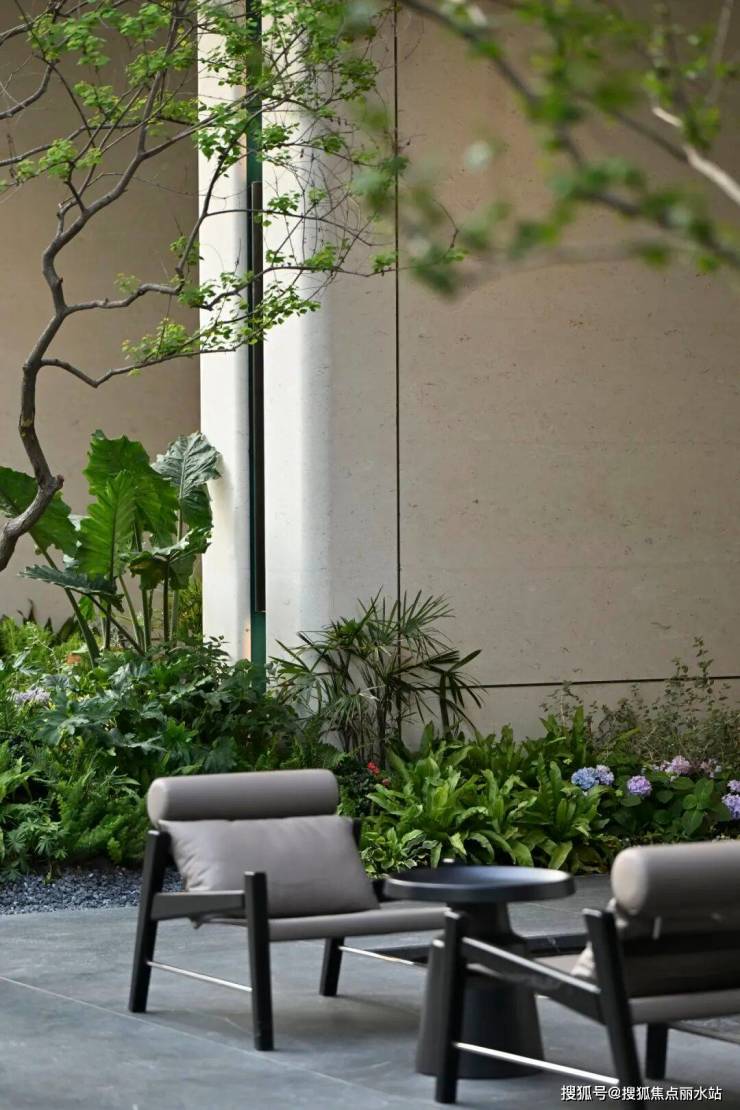 地库入口不再是冰冷的混凝土通道。两侧通过堆坡造景、立体绿化墙、悬垂植物等手法,让盎然的绿意自然渗透、包裹入口空间。利用植物的形态、色彩、质感以及流水潺潺的悦耳声音,在进入地库的瞬间就营造出森林般的沉浸式感官体验。