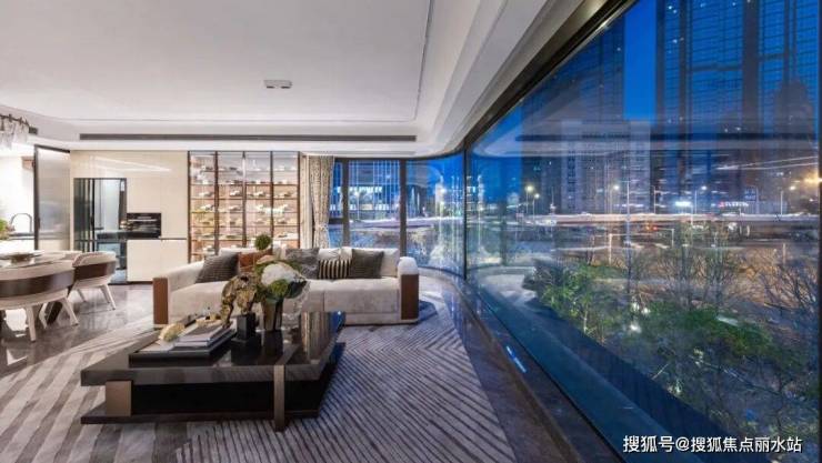 高透超白玻巨幕落地窗引光域流转,精工弧面玻璃消解空间形制,收藏封面级城市景观。
