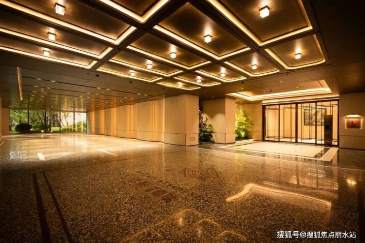 车辆下行,顶部阵列式的丽思卡尔顿同款水晶吸顶灯如星河倾泻,大堂前区的古铜色金属框电动移门感应开启,突显高端酒店式归家仪式感与大都会的摩登奢华气质。
