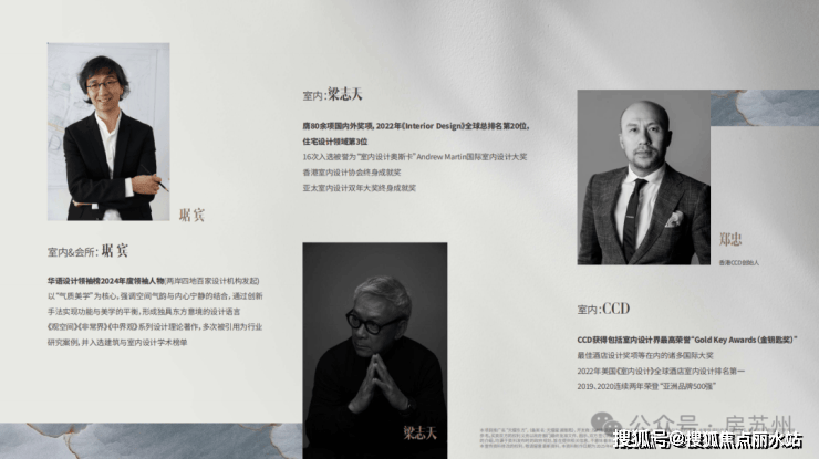4)汇聚国际大师天团。建筑团队:水石;景观团队:观己;室内团队:梁志天、琚宾、郑忠 、CCD 等,各擅胜场,赋能品质人居。
