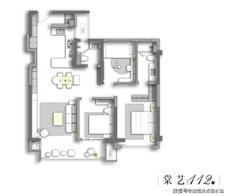 其中约112㎡户型采用完全动静分离格局,三房两厅两卫,配约6.8米宽轩阔客厅、双阳台、主卧套间设计,主打精致改善。