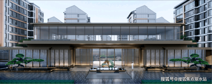 新中式+坡屋顶组合,立面局部采用铝板,南侧采用落地窗设计,形成超大玻璃幕效果。横向线条+竖向框线形成稳定均衡立面效果。