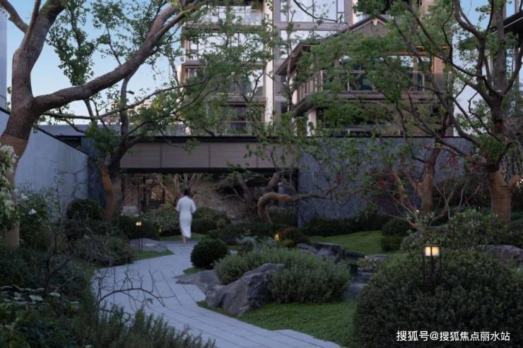 向内渐行是社区的核心景观观景台--望月桥以叠石、理水、建筑、花木四大元素构建「四水归堂」的风雅之景。
