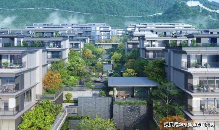 建筑的最高境界,是让自然成为设计的一部分。麓璟云墅没有选择 "削山填谷"的粗暴开发,而是尊重土地原生的坡地地貌:南北约17 m 天然坡 地 差,被转化为 "依山而上"的独特韵律;每一排建筑约2.9 m 的高差设计,让园区如同生长在山体上的有机体,层层递进,错落有致。