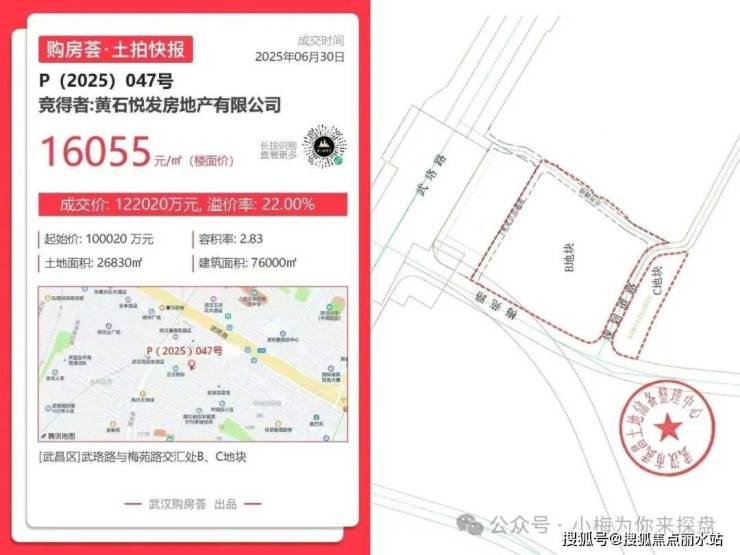 该项目P(2025)047号地块位于武汉市武昌区武珞路与梅苑路交汇处B、C地块,住宅、教育用地。土地面积26830㎡,建筑面积76000㎡,起始价100020万元。是在在2025年6月30日,武汉市举办国有建设用地使用权公开出让活动。福建厦门国企建发集团的关联公司利百控股有限公司旗下黄石悦发房地产有限公司竞价45轮,以总价122020万元竞得武汉P(2025)047号地块(也就是目前的武汉建发·璟玥项目),溢价率22%,成交楼面价16055.26元/㎡拿地价。