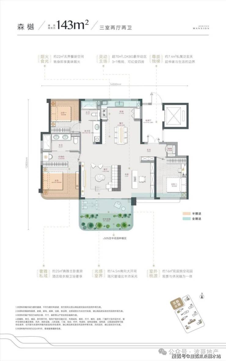 森樾143㎡三房两厅两卫:此户型分布在1/3/5/8/9/10号楼,拥有约7.4㎡独立电梯前室、赠送约16㎡露台;南向开间14.5米、进深12.8米,通透性极佳;大横厅设计可进行3+1布局,拥有约25㎡主卧套间。