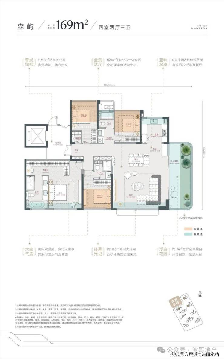森屿169㎡四房两厅三卫:此户型分布在1/2/3/5/7/9/10号楼,拥有约9.3㎡独立电梯前室,赠送约19㎡露台;约18.6米超大南向采光面,南向双套房设计主卧约34㎡,客厅拥有270°采光视野。