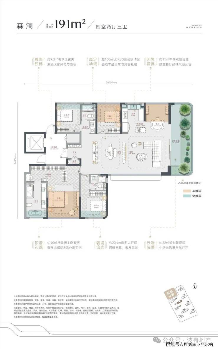 森澜191㎡四房两厅三卫:此户型分布在小区中轴6号楼,拥有约9.3㎡独立电梯前室,赠送约22㎡露台;南向开间约20.4米,南向双套房设计主卧约40㎡。