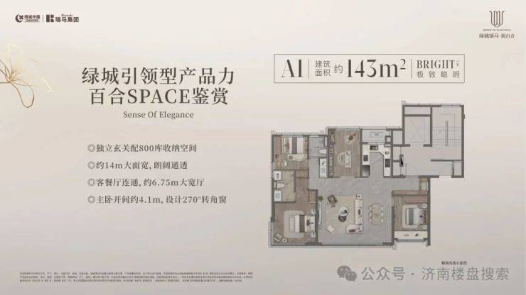 143㎡三/四室:独立玄关+800库收纳空间;约14米面宽;客餐厅连通,约6.75大宽厅;主卧开间约4.1米,带270度拐角落地窗。缺点是有两个北卧。