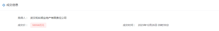 2023年12月26日,武汉和纵顺业地产有限责任公司底价竞得P(2023)096号地块,成交价为505500万元,成交楼面价为17014.5元/平,该地块是2023年的总价地王。