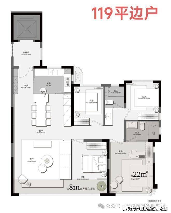 客厅开间约5米,连同南向次卧开间达8米,后期也是可以秒变8米开间大横厅;主卧面积达22平;实得面积同样超过建面119平,得房率超100%。实得面积(含优化)可对标市面上老产品150平的户型。