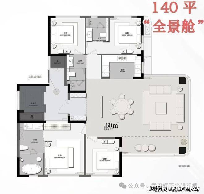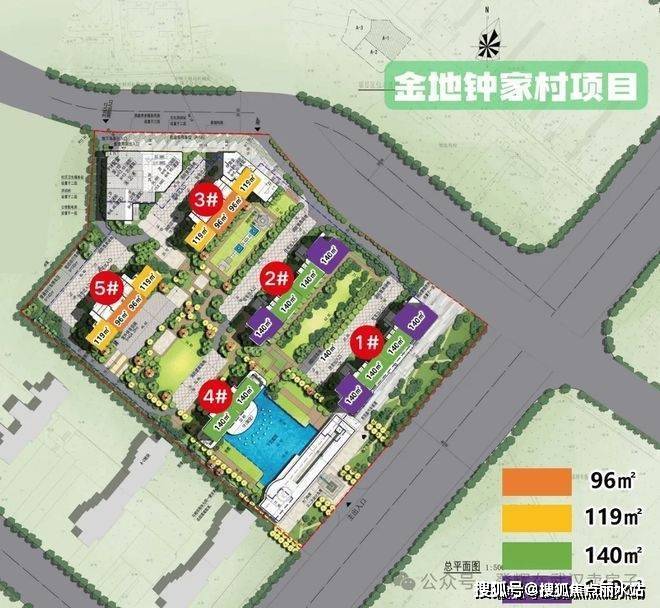 5号楼总高34层,建面96㎡三房、119㎡四房4号楼总高18层,140㎡四房户型,两梯两户