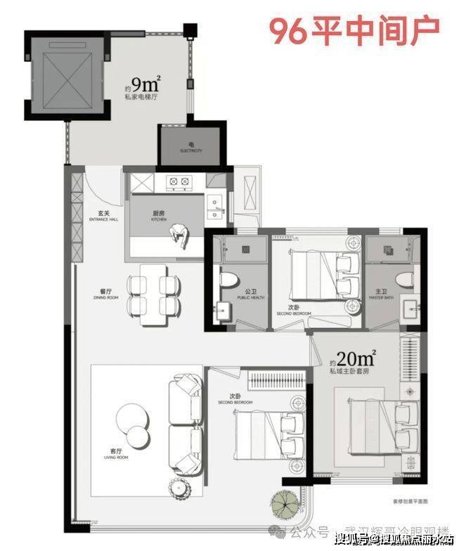 售楼处电话400-8787-098接通后输入5678【营销中心】出电梯有一块约9平米的电梯前室,后期可利用;客厅开间约4.1米,阳台开间约7米,并且还带270度转角视野,因是毛坯交付,后期也可以自己改造成为7米开间的大横厅;主卧面积近20平,在90多平户型里是比较难得的。这个户型实得面积(含优化)可对标市面上普通120-130平的户型。