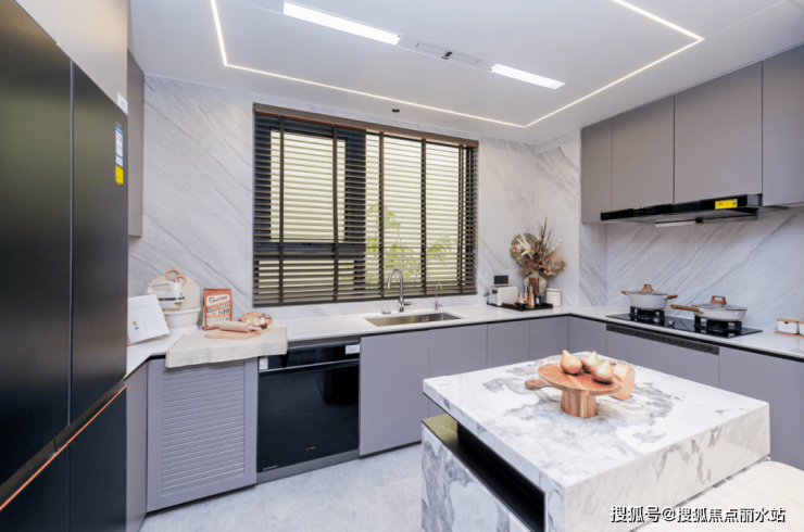 臻如府二期,厨房采光充足且空间开阔,预留双开门冰箱专属位置与内嵌式插座,避免设备外移产生空隙,布局规整有序;大面积操作平台满足日常烹饪与小家电摆放需求,蜂窝大板吊顶搭配线型凉霸与灯带,既低碳节能,又兼具美学与实用价值。柜门采用哑光肤感膜压门板,不易沾染指纹,石英石台面抗渗色易打理,水槽底部柜体铺设防水铝膜,有效防霉防潮。给水管道选用食品级不锈钢材质,环保无污且不易腐蚀、留垢,橱柜内嵌入3M 高端末端净水器,从源头保障用水健康。