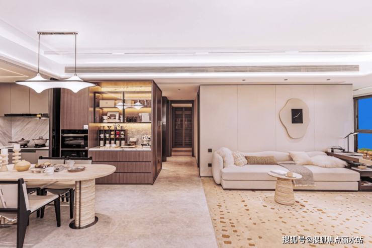 空调出回风口采用定制内嵌式百叶设计,与吊顶完美融合,视觉上浑然一体,格调尽显;客餐厅地暖通铺,地暖盘管采用的整管铺设,增设减震隔音垫,阻隔物体撞击楼板产生的撞击声,减少对楼下邻居造成干扰。