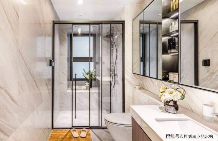 采用高密度HDPE排水管,更加静音;门槛石及淋浴器挡水条底部增设止水钢板预埋,防止渗漏及潮气上返。一体式镜柜收纳,超大置物空间,可以放置化妆品、日用品等;恒温花洒,稳定水温,让沐浴成为一种享受。