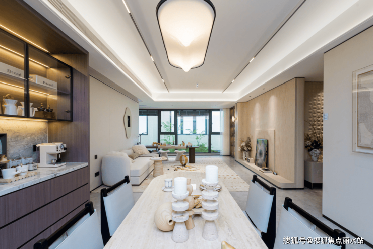 客厅以轩敞面宽勾勒开阔视野,南侧与观景阳台无缝衔接,阳光与景致自然涌入,目之所及皆是通透与豁达;吊顶灯槽嵌入定制石膏线,线条简洁挺拔,餐客厅灯槽整体走边与金属踢脚线上下呼应,在细节处勾勒层次感,尽显美学质感。