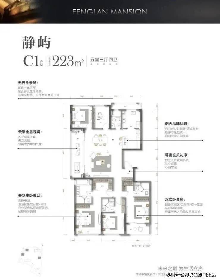 228㎡五房两厅四卫:三开间朝南,南向面宽11.5米,带独立玄关,户型整体格局类似185㎡,三套房设计,大主卧带步入式衣帽间,双阳台设计,南侧一主卧带阳台,餐客厅一体,边厅阳台7.6米,北侧同时布局两房。