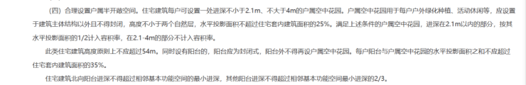 建筑高度54米以下,2.1米(1/2计容)≤不封闭的露台进深≤4米(2.1~4米之间部分不计容),露台不超过套内建面25%;这种建筑若有阳台,必须是封闭阳台;每户阳台和露台水平投影面积不超过住宅套内建面35%,北向阳台进深不超过相邻空间最小进深,其他阳台进深不超过相邻空间最小进深的2/3。