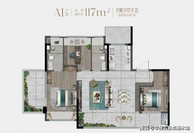 1、只有一种户型。全部为建面约117m²大三房;