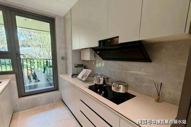 浅色系厨房,连接设备平台,外部空间可以放一些大件不常用的设备收纳。比如自行车、露营装备等。