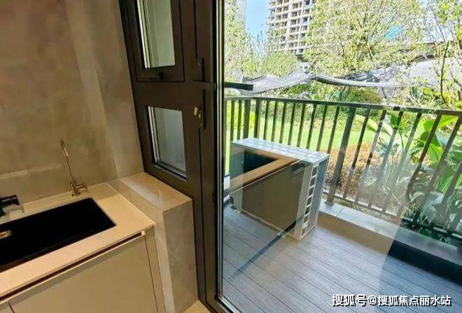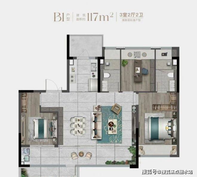 B1户型,露台做在客厅,空间向外延伸,北边厨房连接设备平台,室内利用率再提高。