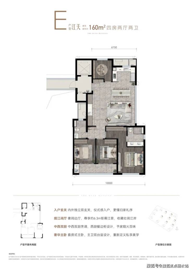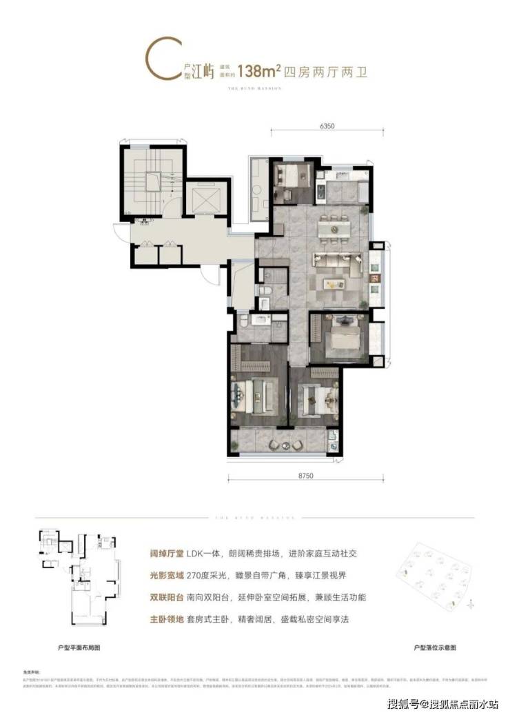 以江水波纹为设计灵感,精筑玻璃天幕立面,公建化立面,全封闭阳台,缀以优雅金属线条,顶部标志性塔冠造型,层层退台,为城市天际塑立时代地标,点睛江岸封面。