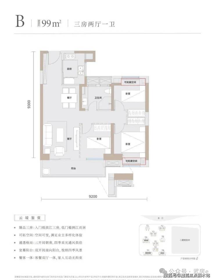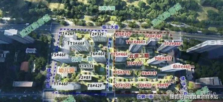 南面全部为低密洋房,北面依旧是高层、超高层,楼栋为东南朝向,其中2栋高层(T9、T10#)、2栋超高层(T11、T12#)是一线看江,高层、超高层都规划了风雨连廊。
