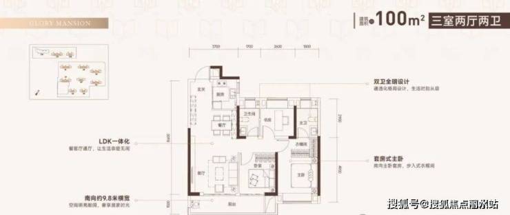 建面约100平三室两厅两卫:此户型位于5号楼中间两户,户型方正,动静分区;三开间朝南,9.8米的超长南向横宽,采光非常好;客厅阳台连通次卧阳台,4个飘窗全赠送,优化面积非常多。刚改入门级产品,预计门槛比较亲民!