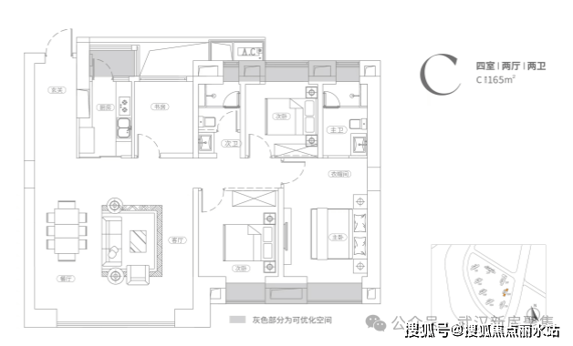 厨房还带有一个生活阳台,日常晾晒均可在此解决,不会影响到日常生活,同时加上每个卧室及卫生间的飘窗,实得面积也相当之多!北面书房后期可作为游戏室、工作室、儿童房、储藏室等等,灵活多变。