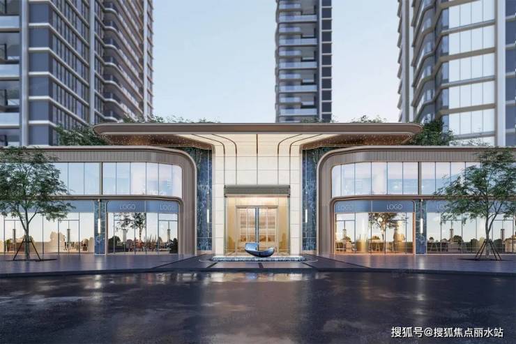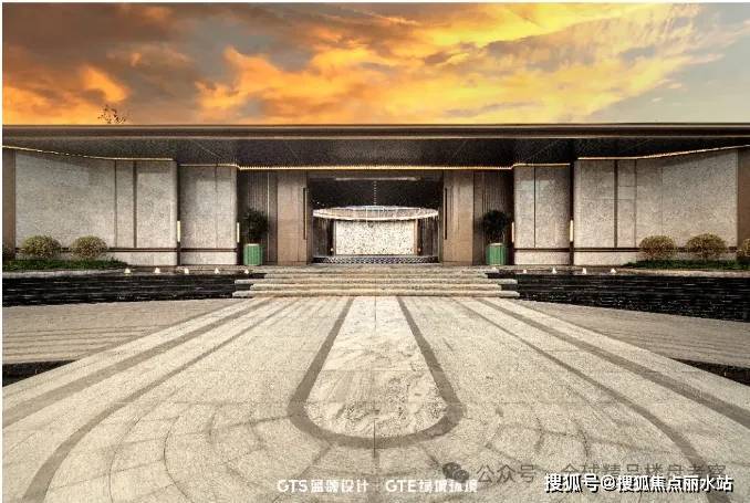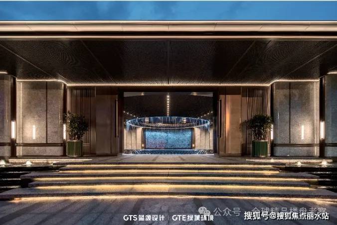 入口门头隐于自然之后,在传统礼序的基础上,融入了酒店式落客理念。弧形入口连接延伸落客平台,叠水景观拾级而上,华灯初上,四时皆景伴水归家。