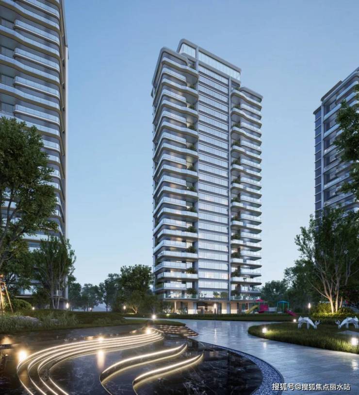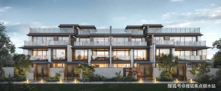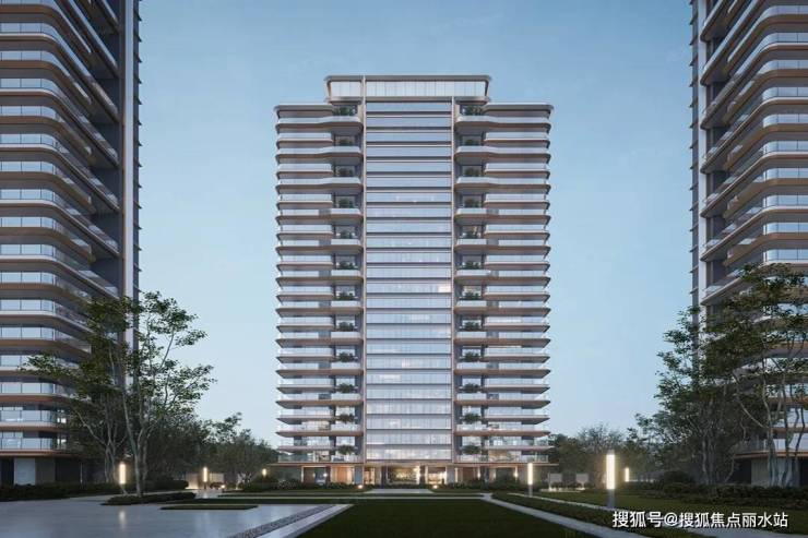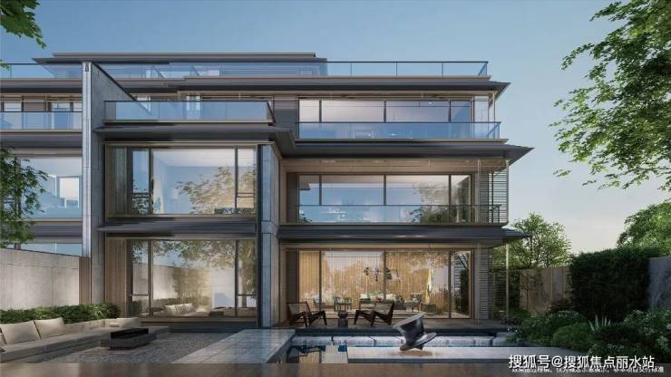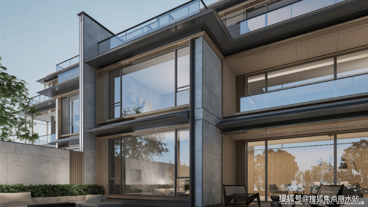 与院墅不同,峯江组团整体采用的是国际风现代立面的设计手法,采用大面积双层中空low-e玻璃配合金属幕墙,简洁硬朗的线条感与空中花园结合,淡雅、轻盈、通透,极具时尚感。