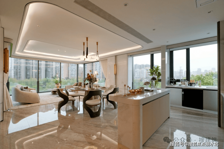 在强化公区方面颇具优势,开放式公域空间(客餐厨一体化)超大面积形成多功能社交场域;传统的端厅产品,入户动线往往遵循先静后动,这种布局在一定程度上影响了居住的私密性;